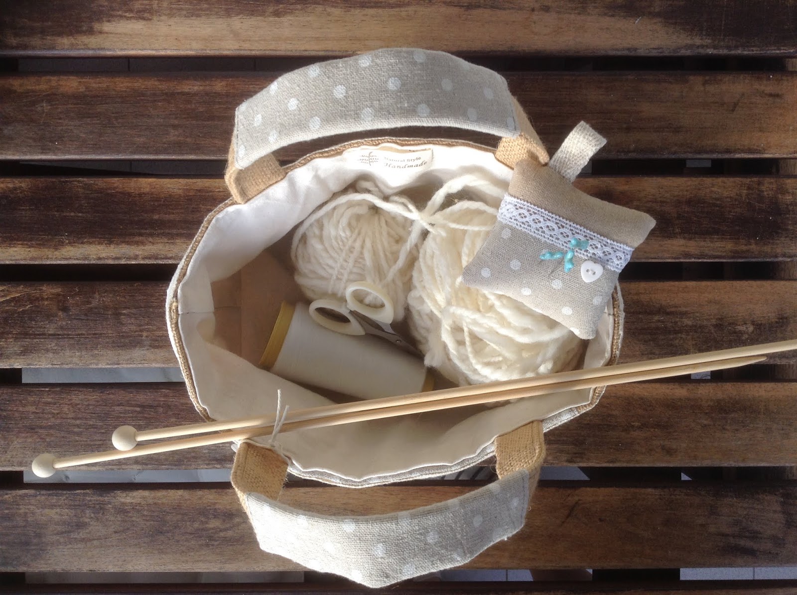 Il cestino di stoffa con il manico, gancetto ed occhiello in nastro da portare sempre con sé, per tenere a portata di mano il gomitolo senza perdere il filo del lavoro oppure per riporvi le cuffie senza che s'intreccino al cavo o ancora per lasciar ricaricare il telefono al sicuro.